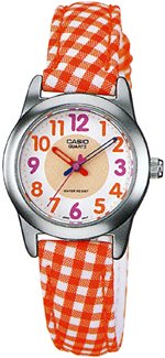 (CASIO)Analogue Watch (LTP-1251B-7B2DF)Casio childs analogue watch with a round shaped face and a polished stainless steel bezel, the face is finished in white and orange with orage and lilac numerals.The strap is orage checked with a s