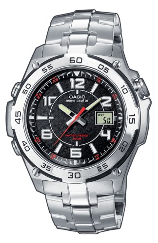 This Casio Wave Ceptor watch has a satin finish Stainless Steel case and bracelet with a smooth highlight running along its length. The black dial is marked with modern numerals and hands both of which have neobrite detailing. The digital display window is used to show the additional features of the watch. Because this watch utilises Casios Wave Ceptor technology whereby it automatically receives time calibration signals from radio transmitters in locations all over the world. This radio controlled watch is dual region which unlike other radio controlled products allow you to switch between the UK and mainland Europe transmitters. The Wave Ceptor will also automatically adjust for daylight savings time. Dimensions: Width = Face - 40mm Width inc bezel =45mm Thickness = 15mm